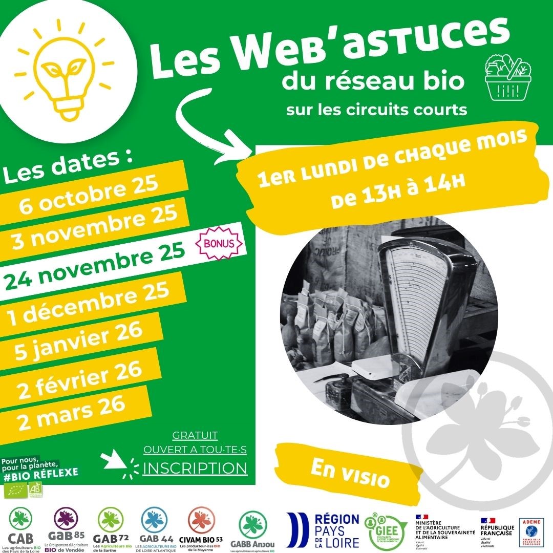 Le GAB Anjou et ses partenaires du réseau bio Pays-de-la-Loire lancent un rendez-vous en ligne mensuel : les Web’astuces, une série de webinaires organisés le premier lundi de chaque mois, de 13h à 14h, à l’attention de tous les producteurs et toutes les productrices travaillant en circuits courts.